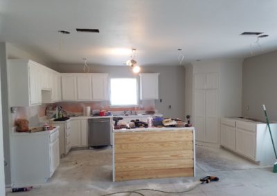 We have made major progress on the exterior, have cleared the overgrowth and dramatically cleaned up the property. Inside the home, we have completed the reconfiguration of the kitchen/living room space to create an open floor plan. The kitchen cabinetry has been resurfaced and prepared for the new granite counter-tops. A new butcher block counter top with bar area was added to the new kitchen island and ship lap siding completed. We completed the beautifully designed 2 X 2 brick column that works as an accent piece between the kitchen and living area. The Master Bathroom has been gutted and plumbing configured for the walk in shower and the double sink vanity has been installed. View the complete photo gallery of this transformation process in the project page.